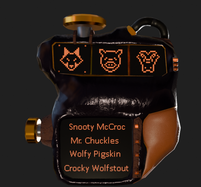 Instead of a row of buttons atop the device its a single knob for each function, rotating tribes, and rotating names. It feels way more natural to me than a row of buttons, because things (as they often do) might change, having a more adaptive method of navigation is a good thing in this case. I also was tinkering with the designs of the Doodads to better represent the 2d menu interfaces we're slowly figuring out-- but rest assured that it's surely. Side note; I enjoyed making the little sprites for the display, was surprisingly more fun that I thought it would be. I've made an LCD shader before that simulated Dot matrix Displays, RGB LED, and some other stuff like color dot CRT stuff. So this wasn't so hard but then I realized I can just make it an image texture and not have to worry about more complex shaders (and conseqeuntly, more shader instructions which add to performance draws). I'm gonna need to touch up the sprites a tiny bit but I still really like this wolf icon.